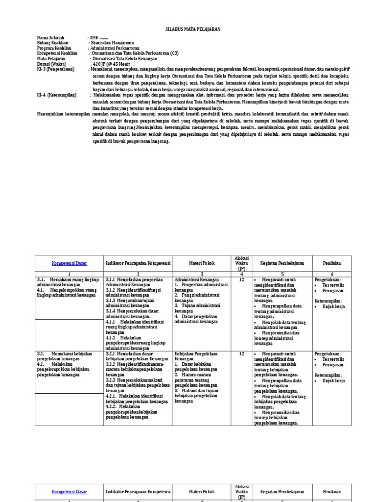 Silabus Otomatisasi Dan Tata Kelola Keuangan from imgv2-1-f.scribdassets.com Otomatisasi dan tata kelola perkantoran (c3) mata pelajaran : Bagaimana dengan buku pegangan guru dan pegangan siswa untuk mata. Dalam menyusun rpp otomatisasi tata kelola keuangan kurikulum 2013 revisi 2017/2018 dan rpp 1 lembar 2019/2020/2021 kelas xi xii semester 1 dan 2 pada tingkat smk/mak, di era covid 19 untuk semua sekolah sesuai himbauan pemerintah wajib melakukan pembelajaran daring walaupun sebagian tatap muka. Otomatisasi tata kelola humas keprotokolan kelas 11 12 kikd17. Bisnis dan manajement kelas : Silabus otomatisasi tata kelola kepegawaian kelas xii 6ng25r5g0jlv. Oleh sebab itu rpp nya untuk mapel otomatisasi tata kelola keuangan juga ada 2 versi yaitu daring. Bisnis dan manajemen program keahlian :