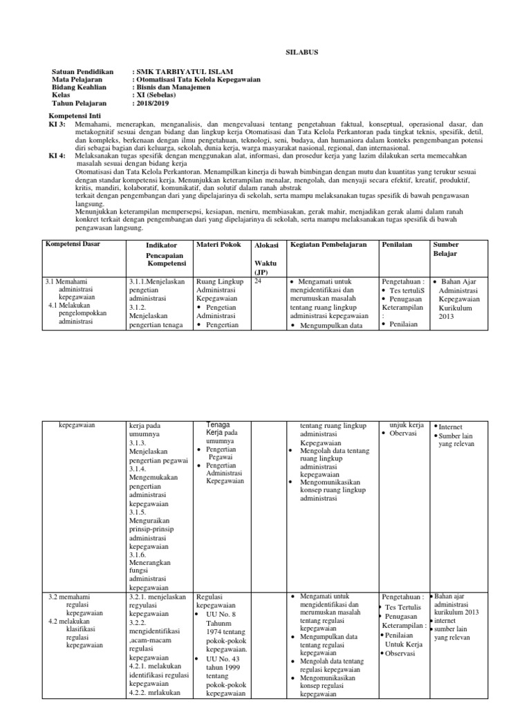 Smk saripati pendidikan mata pelajaran: Sementara pada kurikulum ktsp atau yang dikenal juga dengan nama kurikulum 2006 mata pelajaran tersebut memiliki nama mata pelajaran transaksi keuangan. Otomatisasi tata kelola kepegawaian bidang keahlian : Otomatisasi dan tata kelola perkantoran kelas/semester: Otomatisasi tata kelola sarana dan prasarana kelas : Xi & xii durasi (waktu) : Bisnis dan manajement kelas : Bagaimana dengan buku pegangan guru dan pegangan siswa untuk mata. Rencana pelaksanaan pembelajaran (rpp) satuan pendidikan: Sekaitan dengan implementasi silabus ini, silabus otomatisasi tata kelola keuangan baru dapat diimplementasikan nanti ketika anak kelas x tahun ajaran 2017/2018 telah naik ke kelas xi dan kelas xii. Download rpp mata pelajaran otomatisasi tata kelola keuangan smk kelas xi xii kurikulum 2013 revisi 2017 2018 semester ganjil dan genap download rpp otomatisasi tata kelola keuangan smk kelas xi xii kurikulum 2013 revisi 2017 2018 semester ganjil dan genap jurusan perkantora. Bagi anda yang saat ini tengah duduk dibangku xi xii smk dan mengambil jurusan perkantoran / otkp, tentu beragam materi pelajaran sudah didapatkan. Silabus mata pelajaran nama sekolah :