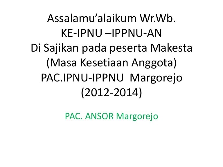 Setelah itu, peserta digiring menuju . View materi_makesta_ipnuippnu.ppt from mipa 101.823 at nusa bangsa university. Ahlussunnah wal jamaah aswaja ala nu (menumbuhkan semangat aswaja ala nu) i. Manusia adalah hamba allah (abdullah) sekaligus pemimpin (khalifatullah filardh) page 49 sekapur sirih . Apa itu pengertian dari makesta (masa kesetiaan anggota), tujuan,.